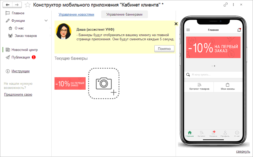 В конструкторе мобильного приложения «Кабинет клиента» появился «Новостной центр». Теперь можно создавать новости и отправлять push-уведомление клиентам. На главную страницу мобильного приложения можно добавить рекламные баннеры.